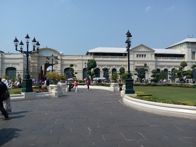 Svoltiamo l'angolo, mangiamo qualcosa, ed eccoci quindi al Grande Palazzo Reale, dove si accede solo con abbigliamento consono. Così come alla grande moschea ad Abu Dhabi, devo indossare i pantaloni lunghi, lasciare una caparra che poi viene resa alla restituzione del capo. Code piuttosto lunghe.